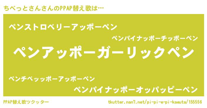ちべっとさんさんのPPAP替え歌は… 『ペンアッポーガーリックペン』『ペンストロベリーアッポーペン』『ペンパイナッポーオッパッピーペン』 ツクッター #PPAP替え歌ツクッター http://tkutter.nan7.net/pi-pi-e-pi-kaeuta/155556/