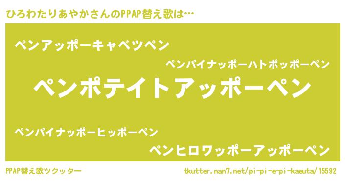 ひろわたりあやかさんのPPAP替え歌は… 『ペンポテイトアッポーペン』『ペンアッポーキャベツペン』『ペンヒロワッポーアッポーペン』 ツクッター #PPAP替え歌ツクッター http://tkutter.nan7.net/pi-pi-e-pi-kaeuta/15592/