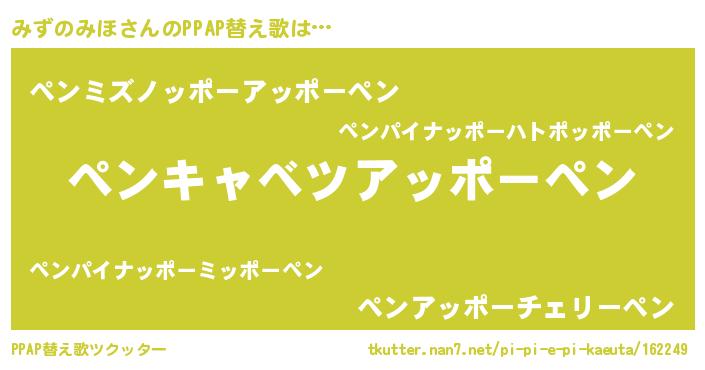 | 意味不明あだ名 | 『自称みずのみほ』『ペロリンみずのみほ』 |