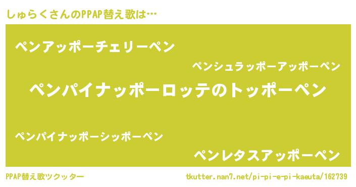 | 料理風あだ名 | 『しゅらくごはん』『しゅらくのトマト煮』 |