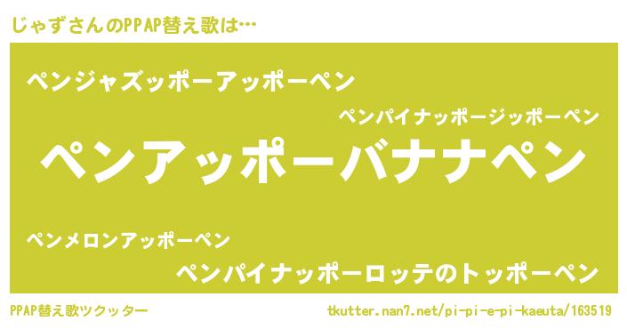 じゃずさんのPPAP替え歌は… 『ペンアッポーバナナペン』『ペンジャズッポーアッポーペン』『ペンパイナッポーロッテのトッポーペン』 ツクッター #PPAP替え歌ツクッター http://tkutter.nan7.net/pi-pi-e-pi-kaeuta/163519/