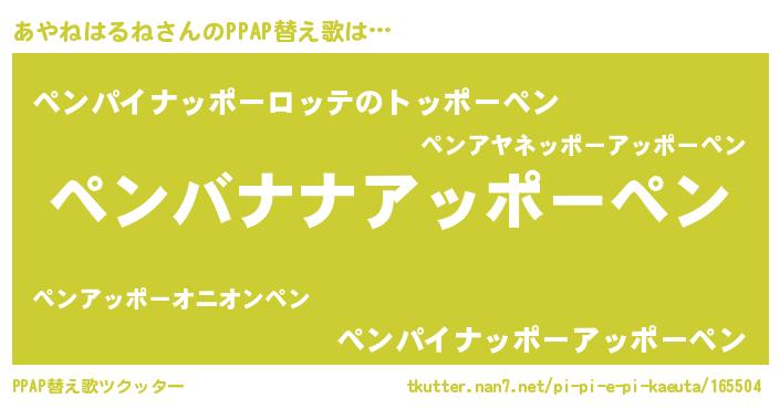 あやねはるねさんのPPAP替え歌は… 『ペンバナナアッポーペン』『ペンパイナッポーロッテのトッポーペン』『ペンパイナッポーアッポーペン』 ツクッター #PPAP替え歌ツクッター http://tkutter.nan7.net/pi-pi-e-pi-kaeuta/165504/