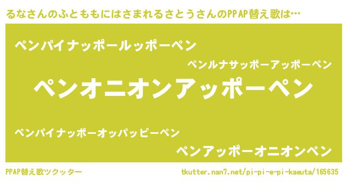| 欧米人風あだ名 | 『るなさんのふとももにはさまれるさとう・ステッグマイヤー』 |
