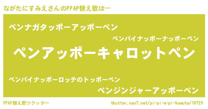 ながたにすみえさんのPPAP替え歌は… 『ペンアッポーキャロットペン』『ペンナガタッポーアッポーペン』『ペンジンジャーアッポーペン』 ツクッター #PPAP替え歌ツクッター http://tkutter.nan7.net/pi-pi-e-pi-kaeuta/16729/