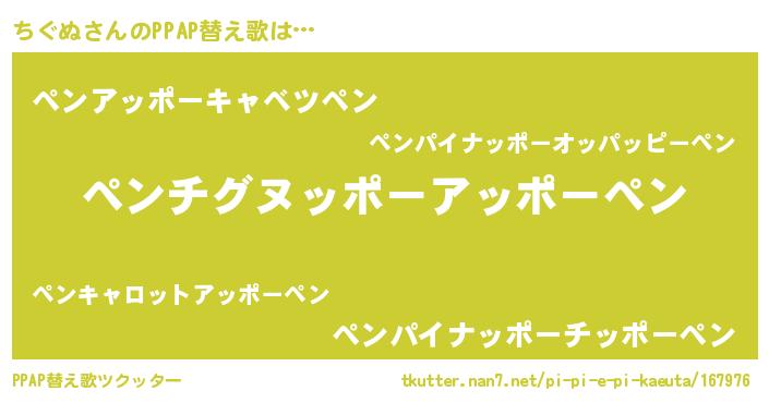 ちぐぬさんのPPAP替え歌は… 『ペンチグヌッポーアッポーペン』『ペンアッポーキャベツペン』『ペンパイナッポーチッポーペン』 ツクッター #PPAP替え歌ツクッター http://tkutter.nan7.net/pi-pi-e-pi-kaeuta/167976/