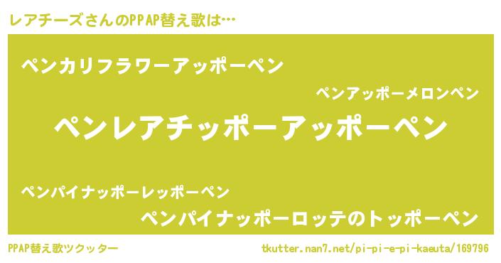 レアチーズさんのPPAP替え歌は… 『ペンレアチッポーアッポーペン』『ペンカリフラワーアッポーペン』『ペンパイナッポーロッテのトッポーペン』 ツクッター #PPAP替え歌ツクッター http://tkutter.nan7.net/pi-pi-e-pi-kaeuta/169796/