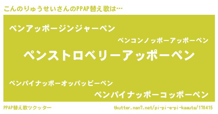 こんのりゅうせいさんのPPAP替え歌は… 『ペンストロベリーアッポーペン』『ペンアッポージンジャーペン』『ペンパイナッポーコッポーペン』 ツクッター #PPAP替え歌ツクッター http://tkutter.nan7.net/pi-pi-e-pi-kaeuta/170415/