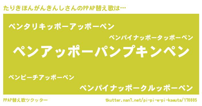 たりきほんがんきんしさんのPPAP替え歌は… 『ペンアッポーパンプキンペン』『ペンタリキッポーアッポーペン』『ペンパイナッポークルッポーペン』 ツクッター #PPAP替え歌ツクッター http://tkutter.nan7.net/pi-pi-e-pi-kaeuta/170885/