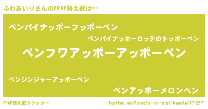 ふわあいりさんのPPAP替え歌は… 『ペンフワアッポーアッポーペン』『ペンパイナッポーフッポーペン』『ペンアッポーメロンペン』 ツクッター #PPAP替え歌ツクッター http://tkutter.nan7.net/pi-pi-e-pi-kaeuta/171257/