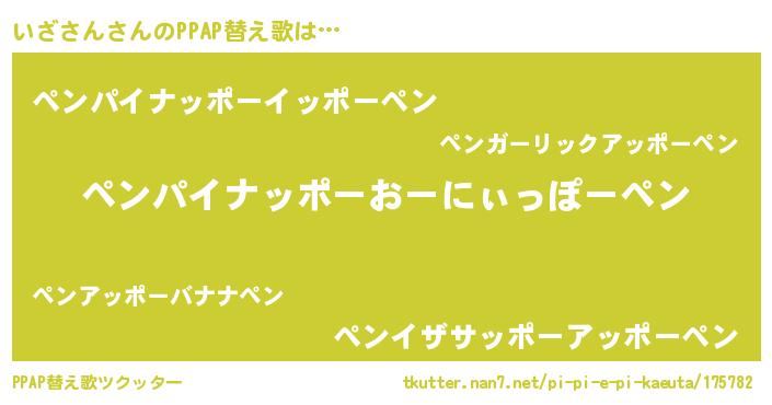 いざさんさんのPPAP替え歌は… 『ペンパイナッポーおーにぃっぽーペン』『ペンパイナッポーイッポーペン』『ペンイザサッポーアッポーペン』 ツクッター #PPAP替え歌ツクッター http://tkutter.nan7.net/pi-pi-e-pi-kaeuta/175782/