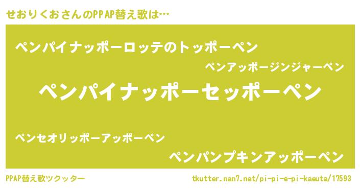 せおりくおさんのPPAP替え歌は… 『ペンパイナッポーセッポーペン』『ペンパイナッポーロッテのトッポーペン』『ペンパンプキンアッポーペン』 ツクッター #PPAP替え歌ツクッター http://tkutter.nan7.net/pi-pi-e-pi-kaeuta/17593/