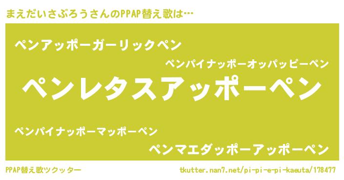 まえだいさぶろうさんのPPAP替え歌は… 『ペンレタスアッポーペン』『ペンアッポーガーリックペン』『ペンマエダッポーアッポーペン』 ツクッター #PPAP替え歌ツクッター http://tkutter.nan7.net/pi-pi-e-pi-kaeuta/178477/
