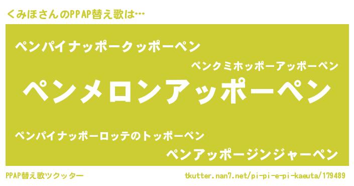 くみほさんのPPAP替え歌は… 『ペンメロンアッポーペン』『ペンパイナッポークッポーペン』『ペンアッポージンジャーペン』 ツクッター #PPAP替え歌ツクッター http://tkutter.nan7.net/pi-pi-e-pi-kaeuta/179489/