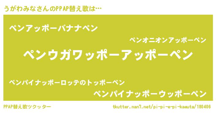| ピコ太郎風あだ名 | 『ウガ八郎』『ピウ一郎』『ピコウ郎』 |