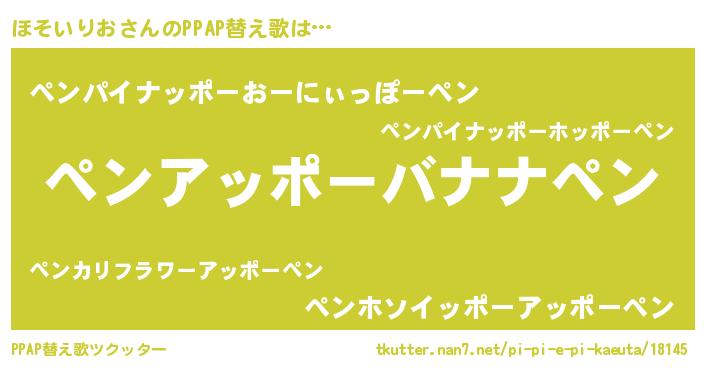 ほそいりおさんのPPAP替え歌は… 『ペンアッポーバナナペン』『ペンパイナッポーおーにぃっぽーペン』『ペンホソイッポーアッポーペン』 ツクッター #PPAP替え歌ツクッター http://tkutter.nan7.net/pi-pi-e-pi-kaeuta/18145/