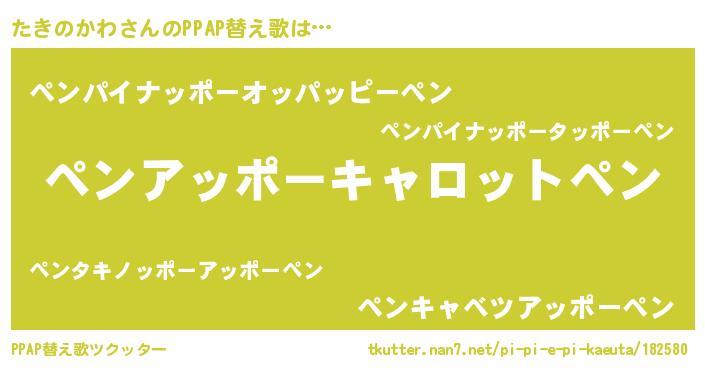 たきのかわさんのPPAP替え歌は… 『ペンアッポーキャロットペン』『ペンパイナッポーオッパッピーペン』『ペンキャベツアッポーペン』 ツクッター #PPAP替え歌ツクッター http://tkutter.nan7.net/pi-pi-e-pi-kaeuta/182580/