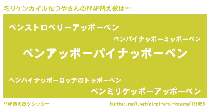 | 欧米人風あだ名 | 『アンジェラ・ミリケンカイルたつや』 |