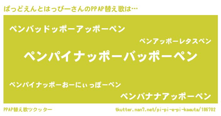 ばっどえんとはっぴーさんのPPAP替え歌は… 『ペンパイナッポーバッポーペン』『ペンバッドッポーアッポーペン』『ペンバナナアッポーペン』 ツクッター #PPAP替え歌ツクッター http://tkutter.nan7.net/pi-pi-e-pi-kaeuta/186702/
