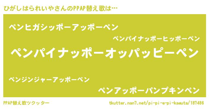 ひがしはられいやさんのPPAP替え歌は… 『ペンパイナッポーオッパッピーペン』『ペンヒガシッポーアッポーペン』『ペンアッポーパンプキンペン』 ツクッター #PPAP替え歌ツクッター http://tkutter.nan7.net/pi-pi-e-pi-kaeuta/187486/