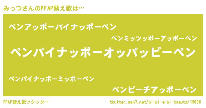 みっつさんのPPAP替え歌は… 『ペンパイナッポーオッパッピーペン』『ペンアッポーパイナッポーペン』『ペンピーチアッポーペン』 ツクッター #PPAP替え歌ツクッター http://tkutter.nan7.net/pi-pi-e-pi-kaeuta/19006/