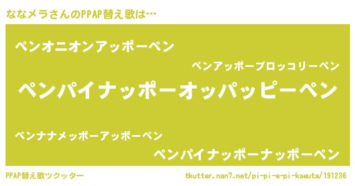 ななメラさんのPPAP替え歌は… 『ペンパイナッポーオッパッピーペン』『ペンオニオンアッポーペン』『ペンパイナッポーナッポーペン』 ツクッター #PPAP替え歌ツクッター http://tkutter.nan7.net/pi-pi-e-pi-kaeuta/191236/