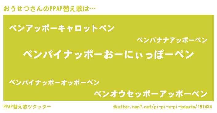 おうせつさんのPPAP替え歌は… 『ペンパイナッポーおーにぃっぽーペン』『ペンアッポーキャロットペン』『ペンオウセッポーアッポーペン』 ツクッター #PPAP替え歌ツクッター http://tkutter.nan7.net/pi-pi-e-pi-kaeuta/191434/