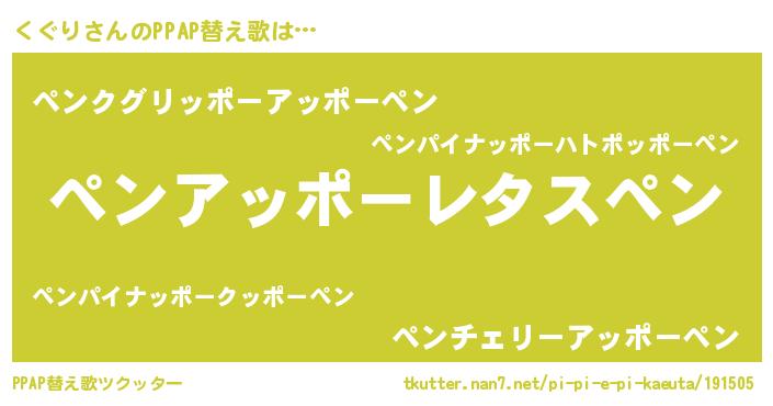 くぐりさんのPPAP替え歌は… 『ペンアッポーレタスペン』『ペンクグリッポーアッポーペン』『ペンチェリーアッポーペン』 ツクッター #PPAP替え歌ツクッター http://tkutter.nan7.net/pi-pi-e-pi-kaeuta/191505/
