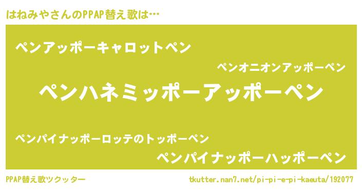 はねみやさんのPPAP替え歌は… 『ペンハネミッポーアッポーペン』『ペンアッポーキャロットペン』『ペンパイナッポーハッポーペン』 ツクッター #PPAP替え歌ツクッター http://tkutter.nan7.net/pi-pi-e-pi-kaeuta/192077/