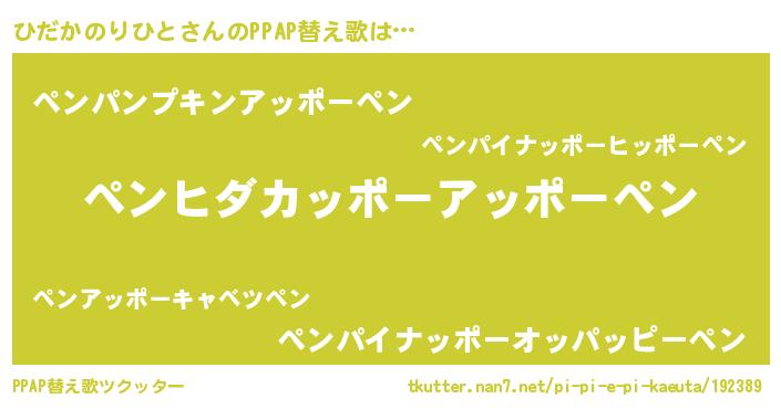 ひだかのりひとさんのPPAP替え歌は… 『ペンヒダカッポーアッポーペン』『ペンパンプキンアッポーペン』『ペンパイナッポーオッパッピーペン』 ツクッター #PPAP替え歌ツクッター http://tkutter.nan7.net/pi-pi-e-pi-kaeuta/192389/
