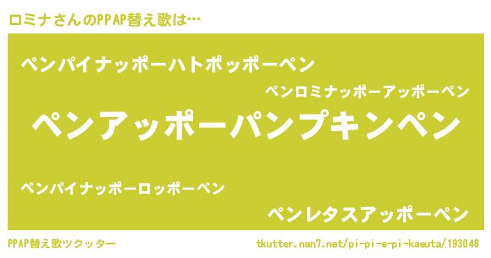 ロミナさんのPPAP替え歌は… 『ペンアッポーパンプキンペン』『ペンパイナッポーハトポッポーペン』『ペンレタスアッポーペン』 ツクッター #PPAP替え歌ツクッター http://tkutter.nan7.net/pi-pi-e-pi-kaeuta/193048/