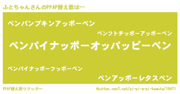 ふとちゃんさんのPPAP替え歌は… 『ペンパイナッポーオッパッピーペン』『ペンパンプキンアッポーペン』『ペンアッポーレタスペン』 ツクッター #PPAP替え歌ツクッター http://tkutter.nan7.net/pi-pi-e-pi-kaeuta/19471/