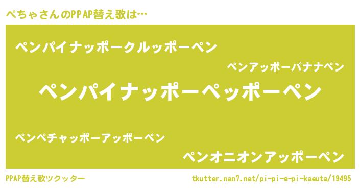 ぺちゃさんのPPAP替え歌は… 『ペンパイナッポーペッポーペン』『ペンパイナッポークルッポーペン』『ペンオニオンアッポーペン』 ツクッター #PPAP替え歌ツクッター http://tkutter.nan7.net/pi-pi-e-pi-kaeuta/19495/