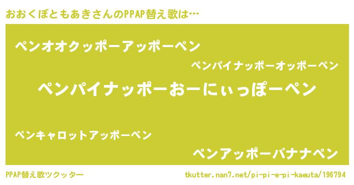 おおくぼともあきさんのPPAP替え歌は… 『ペンパイナッポーおーにぃっぽーペン』『ペンオオクッポーアッポーペン』『ペンアッポーバナナペン』 ツクッター #PPAP替え歌ツクッター http://tkutter.nan7.net/pi-pi-e-pi-kaeuta/196794/