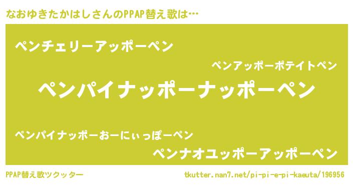 なおゆきたかはしさんのPPAP替え歌は… 『ペンパイナッポーナッポーペン』『ペンチェリーアッポーペン』『ペンナオユッポーアッポーペン』 ツクッター #PPAP替え歌ツクッター http://tkutter.nan7.net/pi-pi-e-pi-kaeuta/196956/