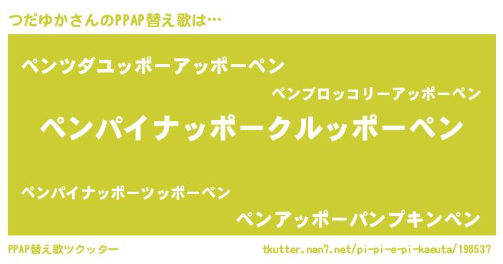 つだゆかさんのPPAP替え歌は… 『ペンパイナッポークルッポーペン』『ペンツダユッポーアッポーペン』『ペンアッポーパンプキンペン』 ツクッター #PPAP替え歌ツクッター http://tkutter.nan7.net/pi-pi-e-pi-kaeuta/198537/