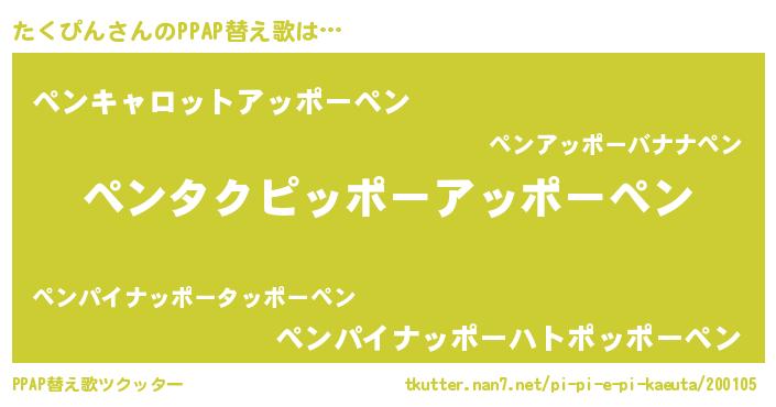 たくぴんさんのPPAP替え歌は… 『ペンタクピッポーアッポーペン』『ペンキャロットアッポーペン』『ペンパイナッポーハトポッポーペン』 ツクッター #PPAP替え歌ツクッター http://tkutter.nan7.net/pi-pi-e-pi-kaeuta/200105/