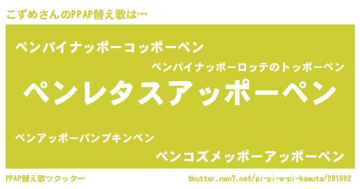 こずめさんのPPAP替え歌は… 『ペンレタスアッポーペン』『ペンパイナッポーコッポーペン』『ペンコズメッポーアッポーペン』 ツクッター #PPAP替え歌ツクッター http://tkutter.nan7.net/pi-pi-e-pi-kaeuta/201992/
