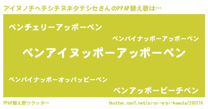| 欧米人風あだ名 | 『ウサインアイヌノチヘチシチヌネタテシセ』 |