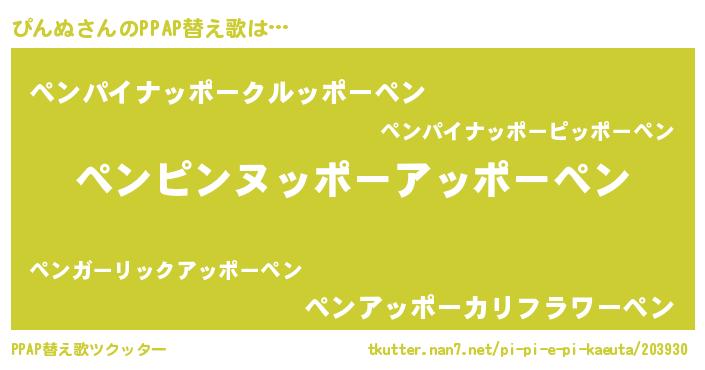 ぴんぬさんのPPAP替え歌は… 『ペンピンヌッポーアッポーペン』『ペンパイナッポークルッポーペン』『ペンアッポーカリフラワーペン』 ツクッター #PPAP替え歌ツクッター http://tkutter.nan7.net/pi-pi-e-pi-kaeuta/203930/