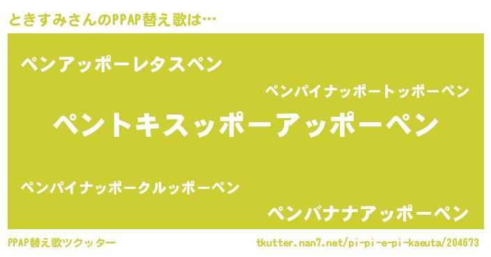 | ピコ太郎風あだ名 | 『トキ二郎』『ピト史郎』『トコ次郎』 |