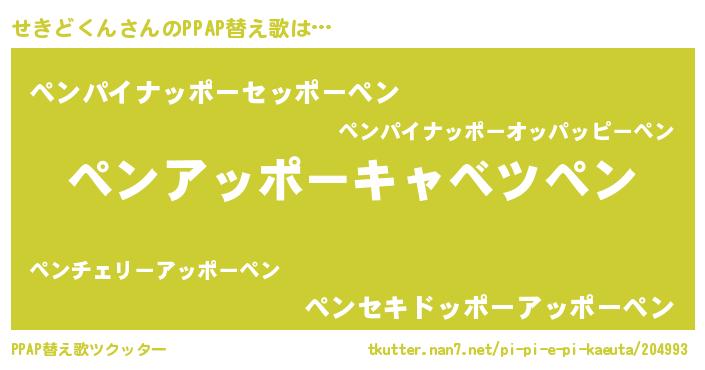 せきどくんさんのPPAP替え歌は… 『ペンアッポーキャベツペン』『ペンパイナッポーセッポーペン』『ペンセキドッポーアッポーペン』 ツクッター #PPAP替え歌ツクッター http://tkutter.nan7.net/pi-pi-e-pi-kaeuta/204993/