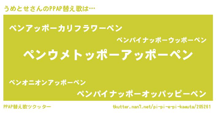 | ピコ太郎風あだ名 | 『ウメ六郎』『ピウ史郎』『ウウ太郎』 |
