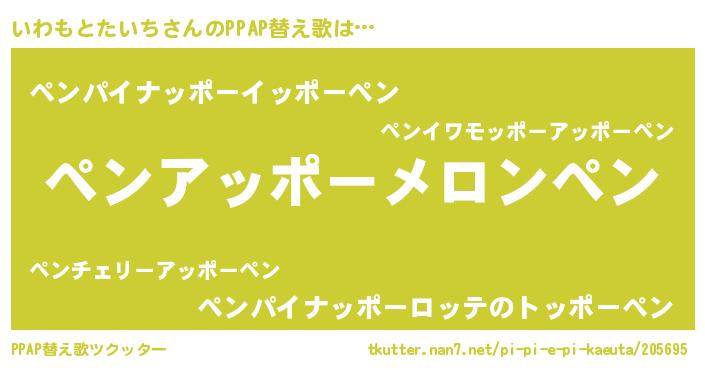 いわもとたいちさんのPPAP替え歌は… 『ペンアッポーメロンペン』『ペンパイナッポーイッポーペン』『ペンパイナッポーロッテのトッポーペン』 ツクッター #PPAP替え歌ツクッター http://tkutter.nan7.net/pi-pi-e-pi-kaeuta/205695/