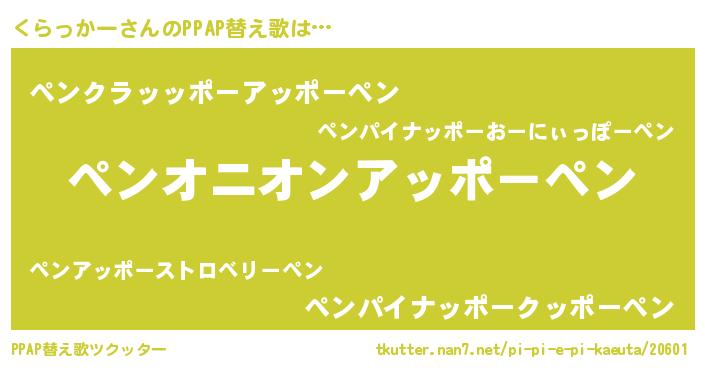 くらっかーさんのPPAP替え歌は… 『ペンオニオンアッポーペン』『ペンクラッッポーアッポーペン』『ペンパイナッポークッポーペン』 ツクッター #PPAP替え歌ツクッター http://tkutter.nan7.net/pi-pi-e-pi-kaeuta/20601/