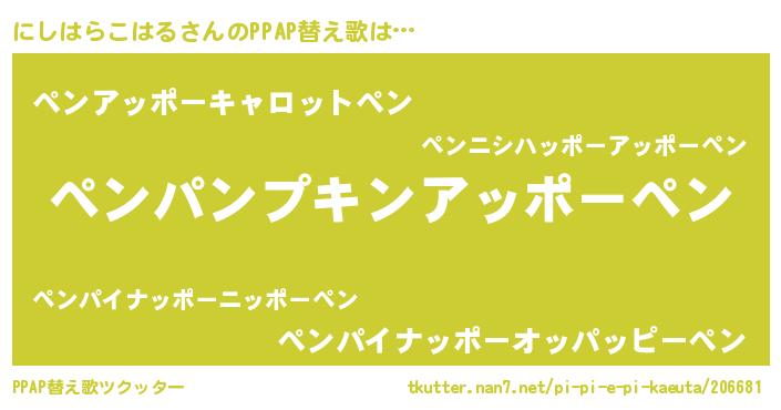 | 男性向けラノベタイトル風あだ名 | 『にしはらこはる~年齢イコール彼女いない歴の魔法使い~』 |