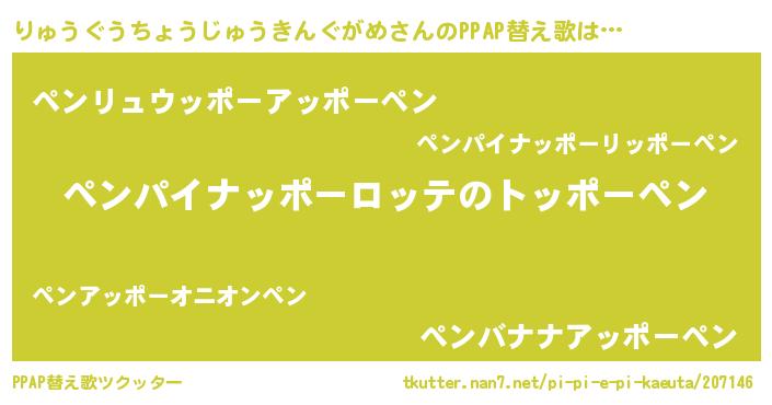 男性向けラノベタイトル風あだ名 | 『うちのりゅうぐうちょうじゅうきんぐがめが世界を掌握している!』 |