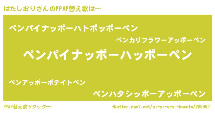 はたしおりさんのPPAP替え歌は… 『ペンパイナッポーハッポーペン』『ペンパイナッポーハトポッポーペン』『ペンハタシッポーアッポーペン』 ツクッター #PPAP替え歌ツクッター http://tkutter.nan7.net/pi-pi-e-pi-kaeuta/208957/