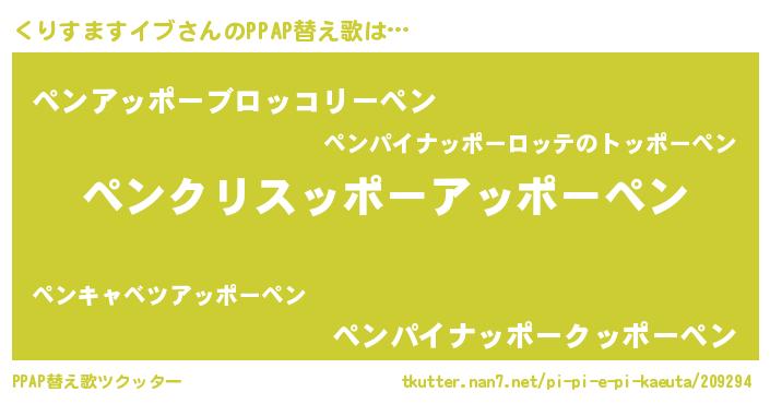 くりすますイブさんのPPAP替え歌は… 『ペンクリスッポーアッポーペン』『ペンアッポーブロッコリーペン』『ペンパイナッポークッポーペン』 ツクッター #PPAP替え歌ツクッター http://tkutter.nan7.net/pi-pi-e-pi-kaeuta/209294/