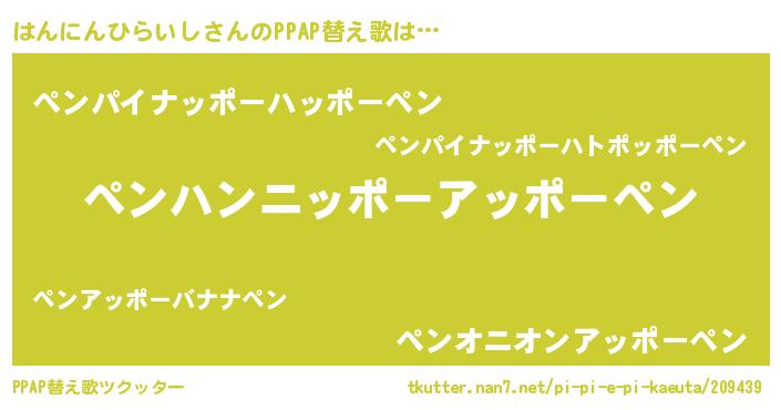 はんにんひらいしさんのPPAP替え歌は… 『ペンハンニッポーアッポーペン』『ペンパイナッポーハッポーペン』『ペンオニオンアッポーペン』 ツクッター #PPAP替え歌ツクッター http://tkutter.nan7.net/pi-pi-e-pi-kaeuta/209439/