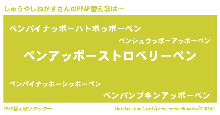 しゅうやしねかすさんのPPAP替え歌は… 『ペンアッポーストロベリーペン』『ペンパイナッポーハトポッポーペン』『ペンパンプキンアッポーペン』 ツクッター #PPAP替え歌ツクッター http://tkutter.nan7.net/pi-pi-e-pi-kaeuta/210150/